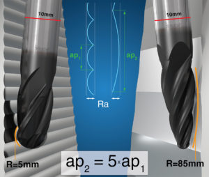 Traditionally, ball-nose and toroidal cutters perform these machining operations. However, the large-diameter arc of the endmill cutting edge results in a substantial reduction of the cusp height generated between passes machined by a ball-nose or toroidal cutter. Another advantage of this type of cutting edge versus ball-nose and toroidal cutters is a significant increase in the distance between passes (a step-over or a step-down, depending on the direction of a cutter displacement after every pass) – at least five times more without degradation of the surface finish parameters!