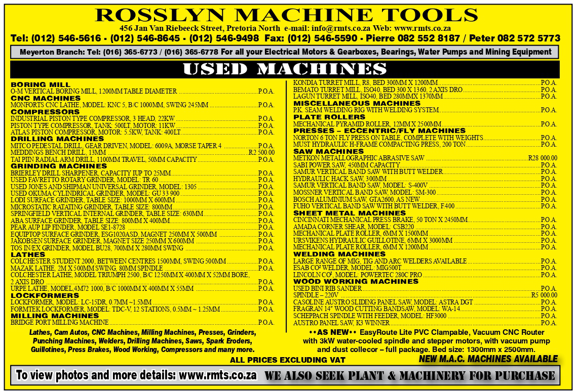 PROMOTIONS USED MACHINERY AVAILABLE 27th September 2021 258 FacebookTwitterLinkedinWhatsApp Visit Rosslyn Machine Tools