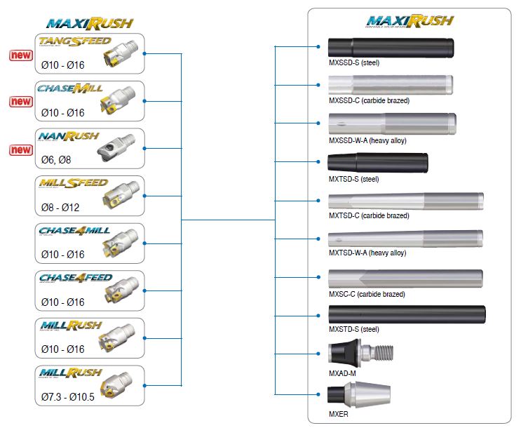 The insert type modular heads of the TANG-SFEED, CHASE-MILL and NAN-RUSH products have been incorporated into the flexible MAXI-RUSH line in order to further diversify the popular line’s application range.