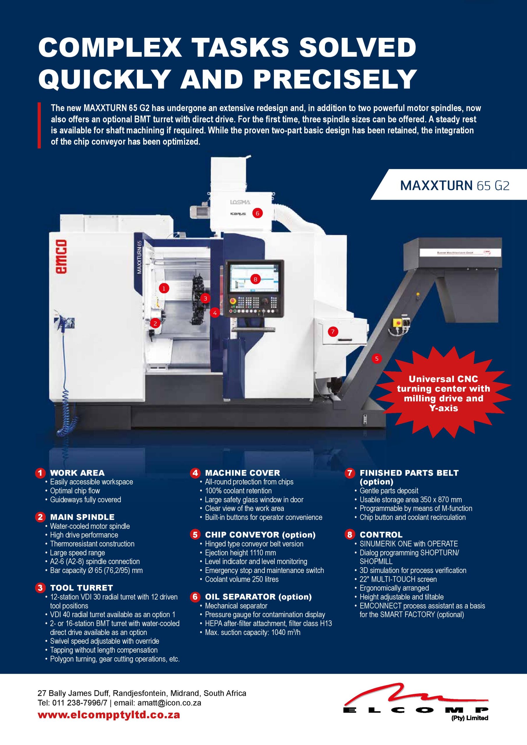 The new MAXXTURN 65 G2 has undergone an extensive redesign and, in addition to two powerful motor spindles, now also offers an optional BMT turret with direct drive. For the first time, three spindle sizes can be offered. A steady rest is available for shaft machining if required. While the proven two-part basic design has been retained, the integration of the chip conveyor has been optimized.