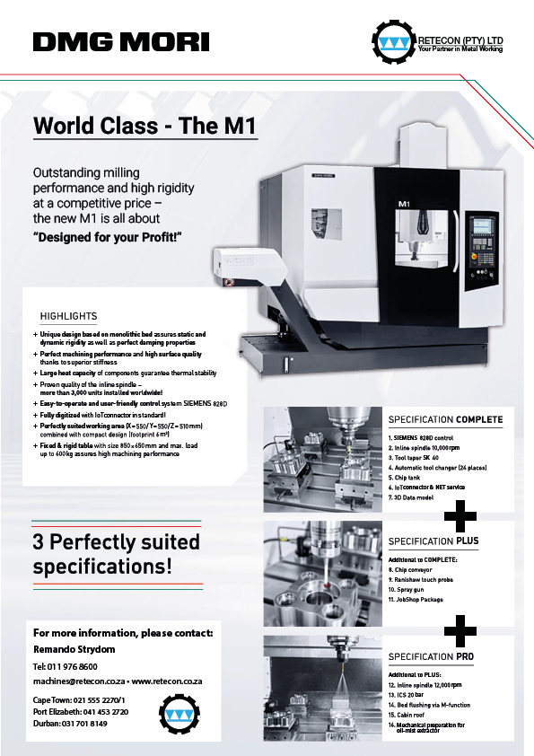 The DMG MORI M1 milling machine locally available from Retecon offers perfect machining performance and high surface quality thanks to superior stiffness, while large heat capacity of the components guarantees thermal stability. The unique design of the machine is based on a monolithic bed.