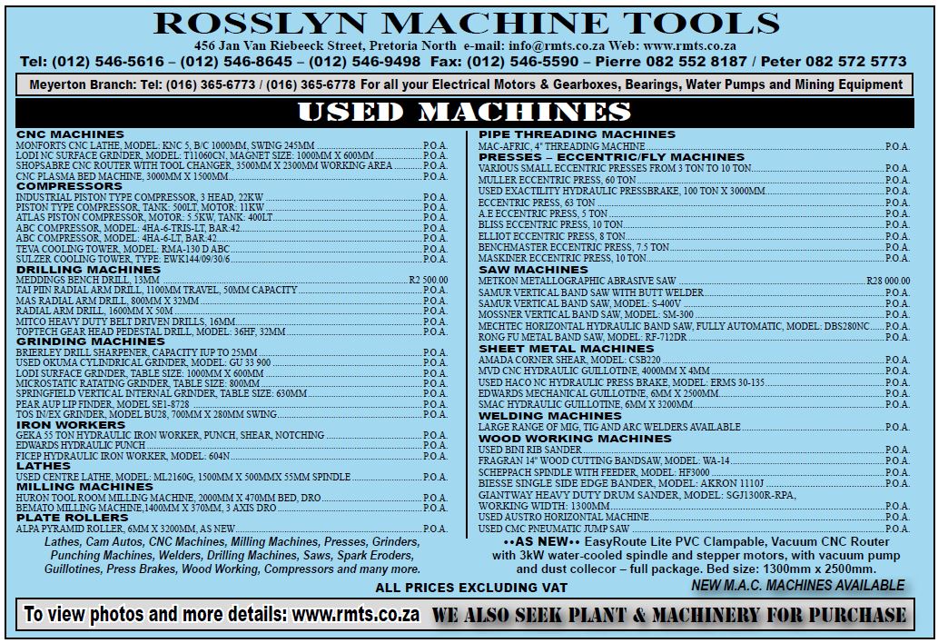 PROMOTIONS USED MACHINERY AVAILABLE 24th May 2023 147 FacebookTwitterLinkedinWhatsApp Visit Rosslyn Machine Tools