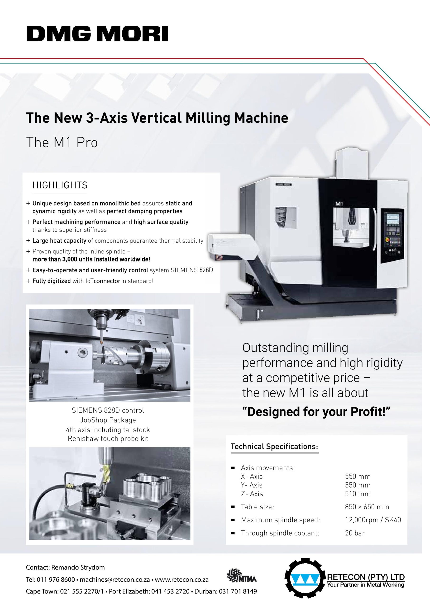 Nowadays, the biggest challenge for most of the companies is to constantly reduce production costs in order to stay competitive. DMG MORI has met customer needs and market requirements with the new M1 machine. It fits onto every shop floor in the world, from very small companies or start-ups which need a cost-effective solution, as well as big production plants which are looking for a simple and accurate 3-axis milling machine. The combination of uncompromised DMG MORI quality with an unbeatable price makes the M1 a perfect solution for all 3-axis parts which do not require a machining process on more expensive and more technologically advanced milling centres. That’s what “Designed for Profit” stands for.