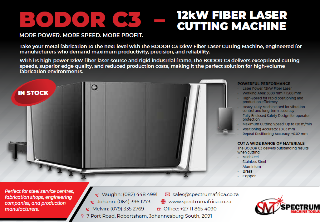 PROMOTIONS BODOR 12KW FIBER LASER FROM SPECTRUM MACHINE TOOLS 16th March 2026 153 FacebookXLinkedinWhatsApp Visit Spectrum Africa